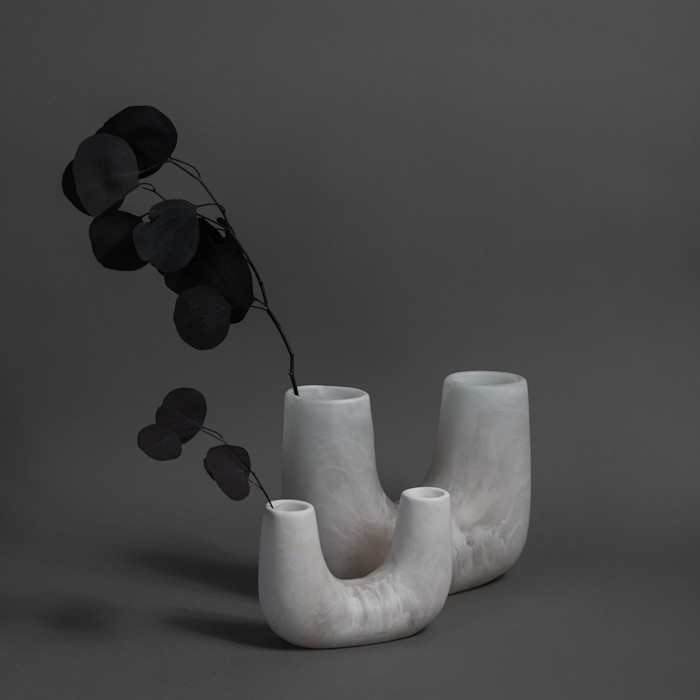 ENQUIRE ABOUT THIS PRODUCTResin vase with two openings - Snow Swirl. Approximate dimensions Height: 12cm / 4.7in Length: 17cm / 6.6in Diameter of openings: 3cm / 1.1in Please note, not recommended to use with candles. Dinosaur Designs resin products are hand made in Australia. Each piece is unique and we cannot guarantee you will receive an item exactly identical to what is that shown online. Colours and swirls shown are a guide only.